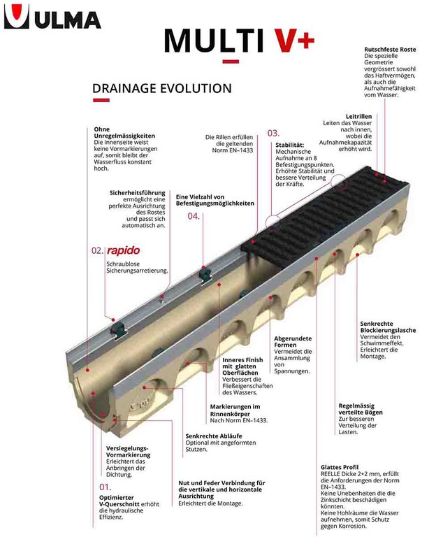 Das Design der MultiV+-Entwässerungsrinnen wurde dank der V-Form und der Rapidlock® Sicherungsarretierung so optimiert, dass die Kosten für Ihre Arbeit oder Ihr Projekt optimieren können. Ein weiterer Vorteil ist, dass diese Rinne zu einem attraktiven Preis angeboten wird.