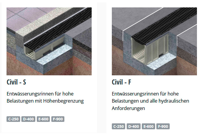 Systeme wie KompaqDrain, Civil F und Civil S wurden entwickelt, um hohen Belastungen und intensiven Verkehrsströmen standzuhalten – und dabei jederzeit eine sichere, effiziente und wartungsarme Entwässerung zu gewährleisten.