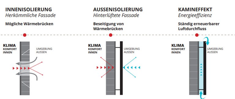 Mit dem System der hinterlüfteten Fassade wird eine Luftkammer zwischen Wärmedämmung und Verkleidung geschaffen.
