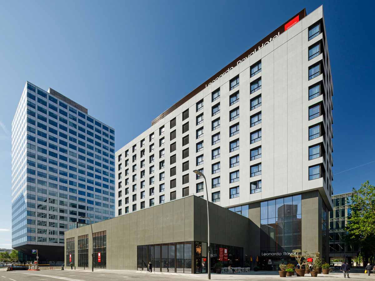 Wir sprechen vom Leonardo Royal Hotel, im Gebäudekomplex des Portal Firal, in den es sich diskret und kohärent mit 5 Gebäuden, aus denen sich die Einheit zusammensetzt, einfügt.