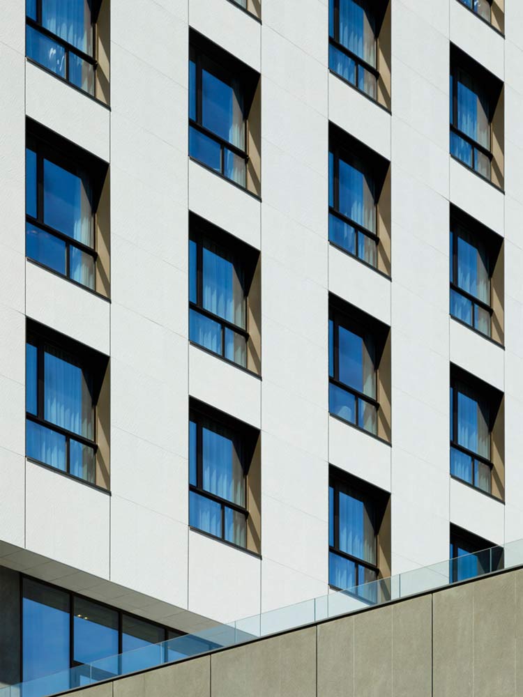 Das Installationssystem von ULMA erlaubt verschiedene Fugenlösungen. Und da wir wissen, dass diese nützliche Designwerkzeuge für Architekten sein können, haben wir verschiedene Möglichkeiten. Die kleinste Fuge mit 3,5 mm, die mit 8 mm, mit 15 mm und 20 mm, die für dieses Hotel ausgewählt wurde. Diese Lösung vermittelt das Gefühl von Vertikalität, da elegante schmale Streifen an der Fassade erzeugt werden.