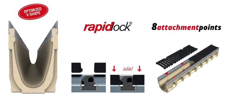 Rapidlock® is a quick, screwless locking system which allows you to quickly, safely and easily attach the grating to the channel body with a simple click.