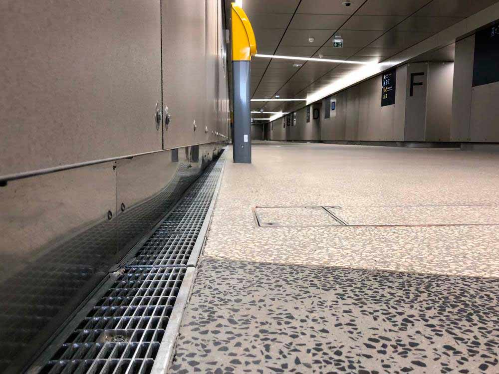 ULMA Architectural Solutions supplied mini range polymer concrete shallow drainage channels. This range is specially designed for areas with height limitation and load classes up to C250. Since this specific case involved a pedestrian tunnel, channels with heel-proof grates that comply with PMR regulations for people with reduced mobility were installed.