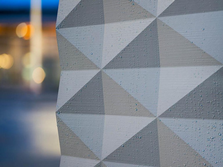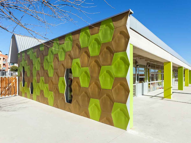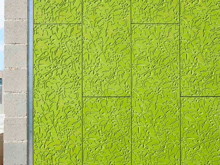 En esta fachada destaca el dibujo de la placa en forma de hoja de parra y bajo relieve además de la integración que se consigue con el entorno. La sensación es la de un tapiz continuo sobre la fachada.