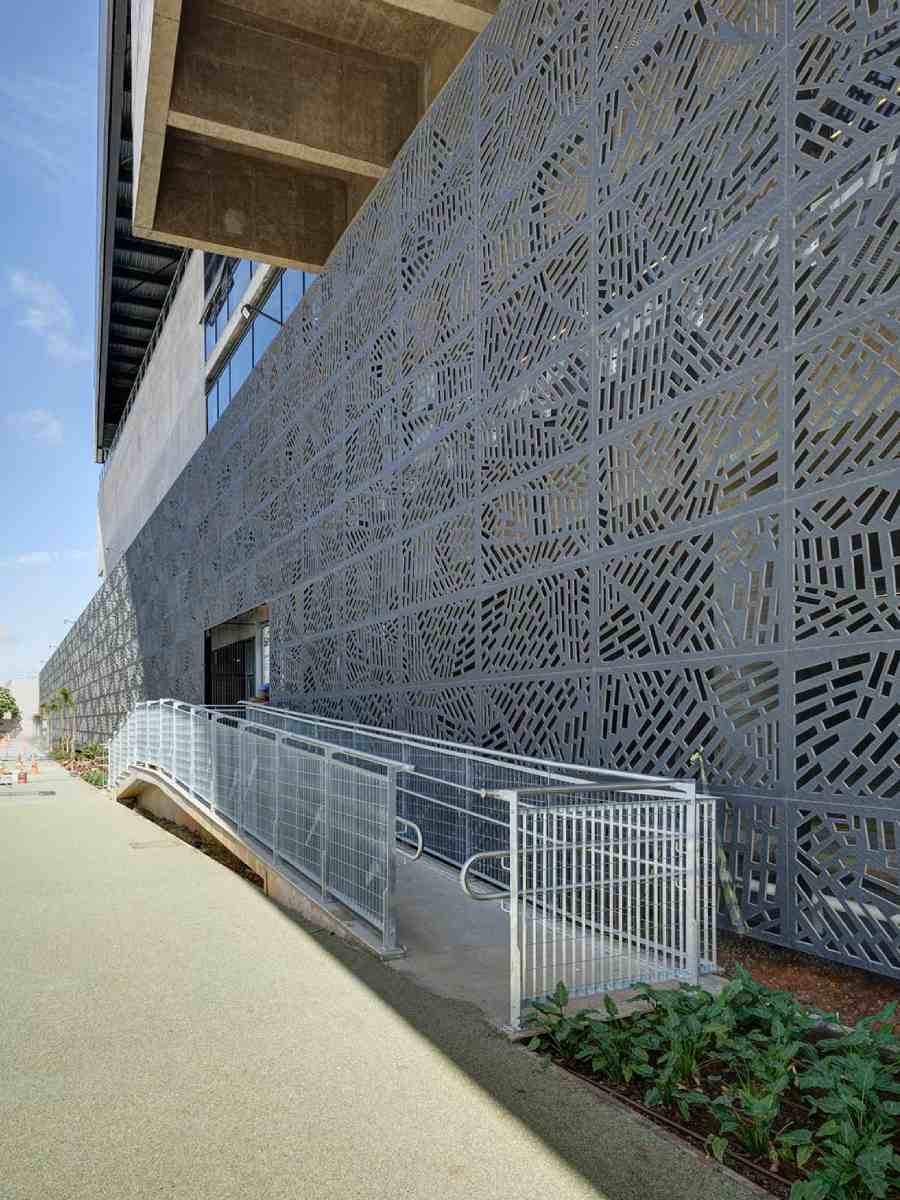 El uso de placas perforadas permite mantener la continuidad estética de la envolvente al mismo tiempo que facilita la circulación de aire desde el interior del edificio hacia el exterior. De este modo, la fachada actúa como un filtro que protege las aberturas y permite la ventilación natural sin renunciar a una imagen arquitectónica coherente.