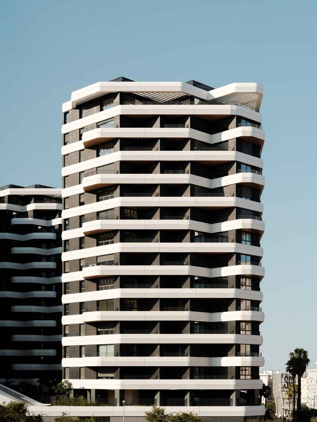 En este contexto, ULMA Architectural Solutions participa con más de 5.200 m² de fachada ventilada STONEO, utilizando la textura de la gama LOOK - Mini Onda vertical como contrapunto al dinamismo de las terrazas. El sistema aporta orden, repetición y coherencia, construyendo una lectura unitaria del conjunto a través de una paleta cromática esencial, basada en el contraste entre blanco y negro.