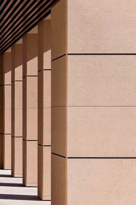 Para los dos cuerpos laterales se buscó un color, acabado y despiece distintos que favoreciera el contraste de estos dos volúmenes con el volumen central. Se escogió la textura papel en color M05 que nos aportaba modernidad y gran contraste con el encuentro de la fachada principal en el máximo formato de panel.