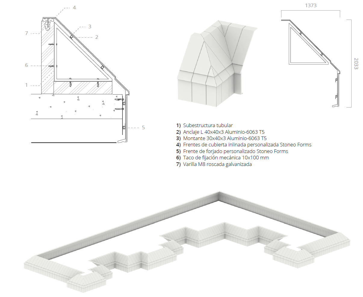 El objetivo era claro: conservar la estética original del edificio replicando cada una de sus piezas arquitectónicas. Para lograrlo, desde la Oficina de Arquitectura de ULMA diseñamos los moldes necesarios y fabricamos más de 2.500 piezas a medida en STONEO, cortadas en inglete e identificadas una a una con su angulación exacta. Este trabajo minucioso permitió un ensamblaje limpio y milimétrico, teniendo en cuenta incluso la inclinación de cada frente de coronación.