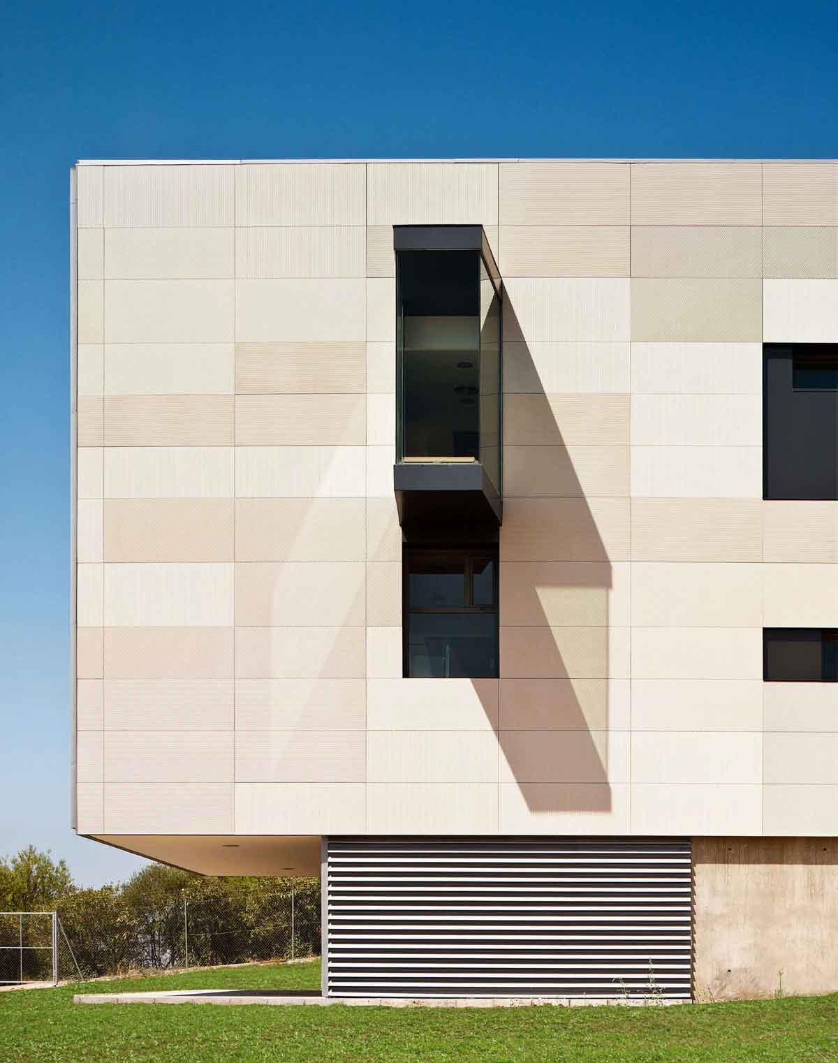La elección de los materiales y productos que conforman la envolvente y sus revestimientos se torna en un capitulo de especial y delicada importancia. Unas precisas condiciones de durabilidad y bajo mantenimiento de los paneles de Stoneo, unidas a unos requisitos de resistencia superiores a los convencionales limitan el listado de productos. Debido a sus posibilidades técnicas, precisión de montaje, calidad de acabado y sobre todo a la estabilidad térmica, en una zona tan cercana a la sierra y con grandes saltos de temperatura.