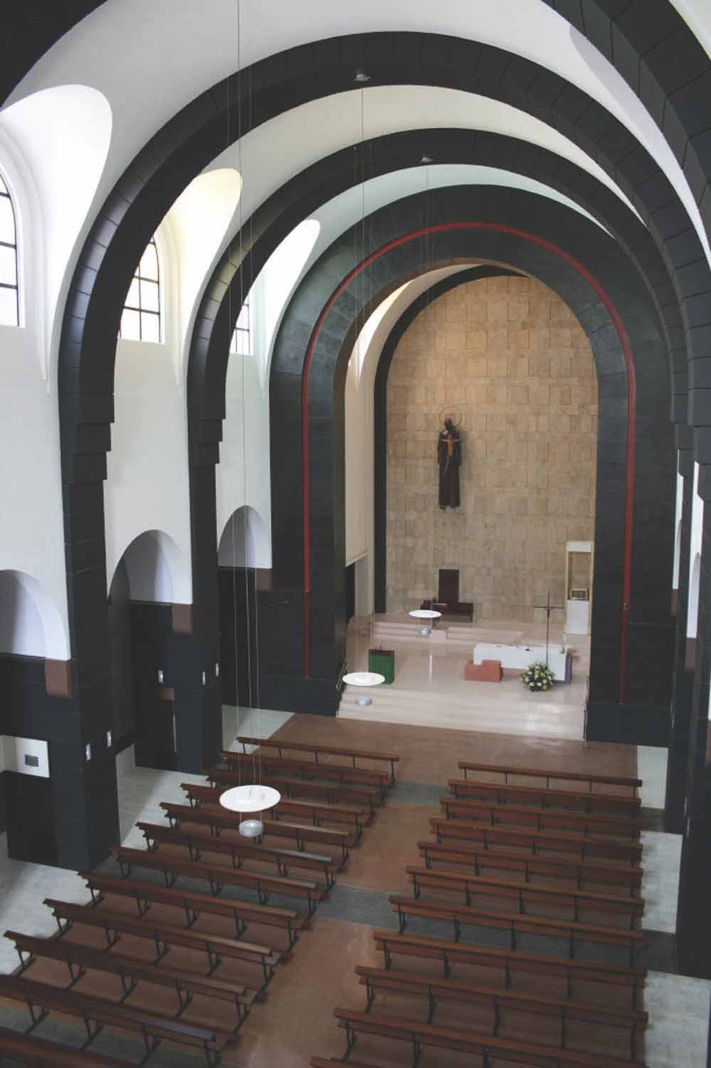 Arkuak kolore beltzean nabarmendu dira 16 m garai den ganga zurian, eta horrek modernotasun ukitua eman dio.
