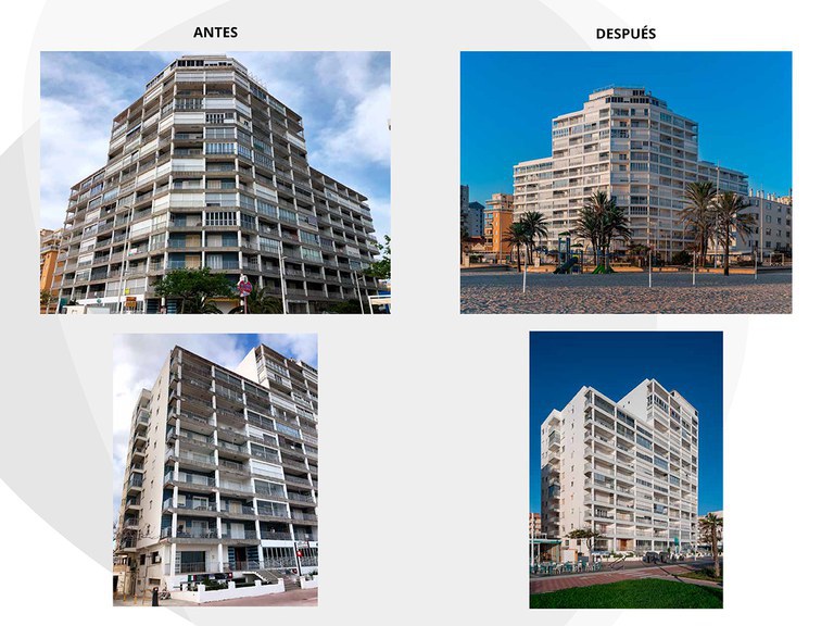 Ingurune gazia eta giroko hezetasuna dira hondartzako lehen lerroan dauden fatxaden narriaduraren arrazoi ohikoenak. Itsasora begira dagoen eraikin lerromakur ikusgarri hau itsustuta zegoen, igarotako denboraren eta itsasoaren korrosioaren ondorioz. Rafael Rivera arkitektoak 70eko hamarkadan diseinatu zuen, eta bere jatorrizko forjatuak, metro bateko zabalerakoak, aldatu behar ziren aurrefabrikatu batzuekin, lehendik zeudenen L forma berdinarekin. Hori bai, orain giro gaziekiko erresistentea den material batekin eginak izango dira, Stoneo erabiliko da. Ia iragazgaitza denez, ura ez da piezetan sartzen, eta, horri esker, piezak giro korrosiboenetan ere erresistenteak eta iraunkorrak dira.