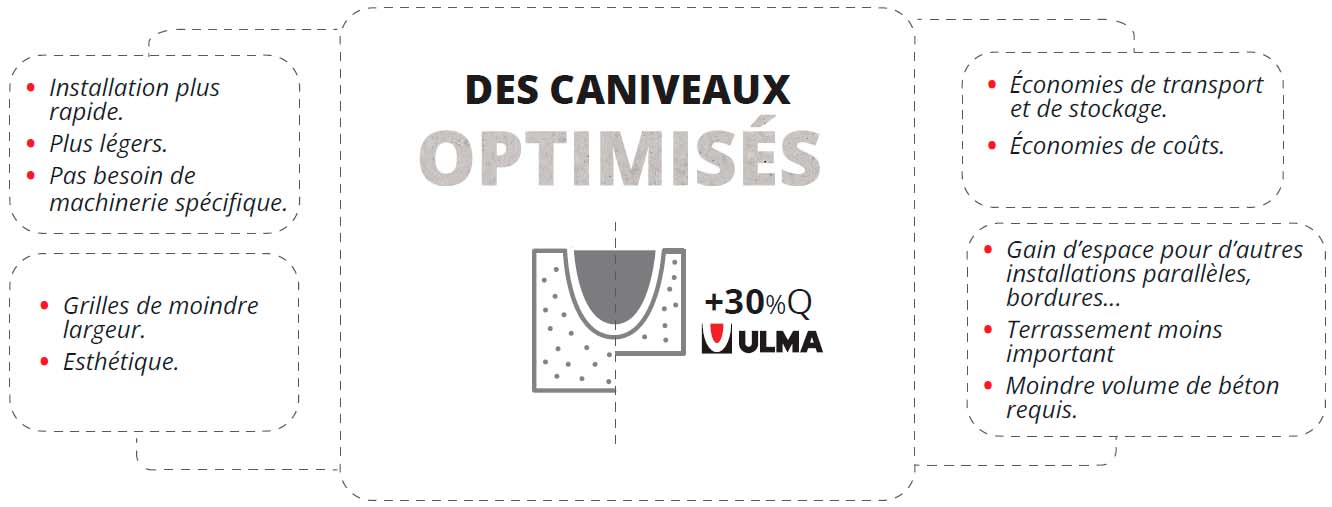 Par rapport aux systèmes traditionnels coulés sur place, les caniveaux béton polymère ULMA sont plus résistants, plus légers, et plus faciles à manipuler. Leur conception limite les risques de casse ou de désalignement dans le temps.