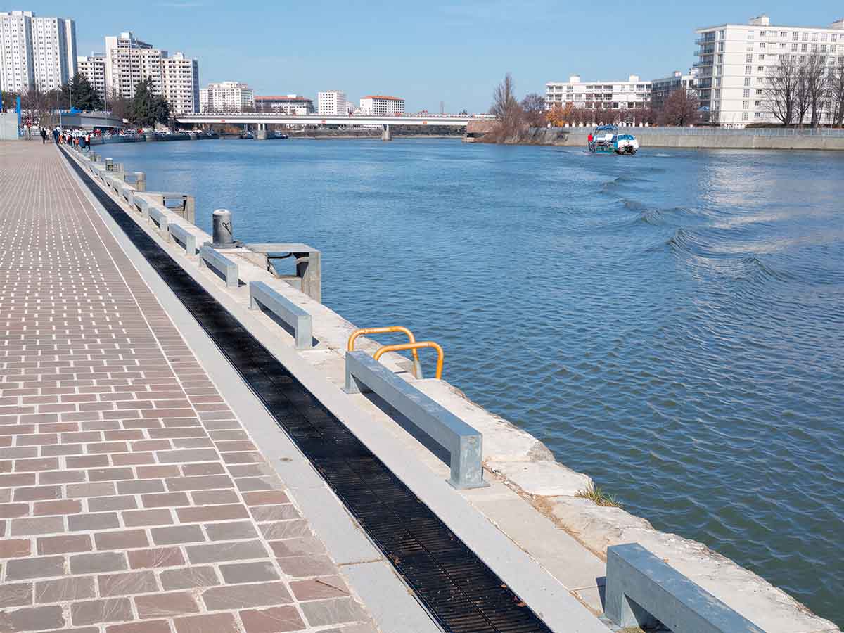Ce projet emblématique a été pourvu d’une solution de drainage à pente étagée, au moyen du caniveau F300K en diverses versions de hauteurs différentes. La grille choisie pour ce projet est le modèle en fonte nervuré en classe F900. 700 mètres linéaires de caniveaux de drainage ont été mis en place.