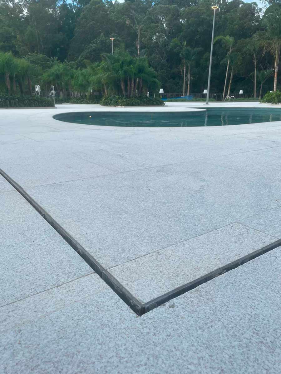 Le résultat final est un système de drainage efficace et sans impact visuel. Les caniveaux ont été installés autour des piscines ainsi que dans les espaces extérieurs situés entre les bâtiments, en remplacement de l’ensemble du drainage existant.