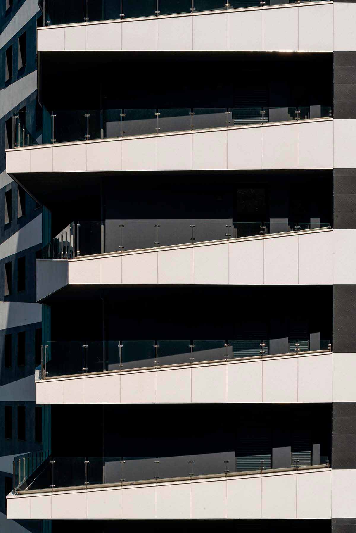 Como você pode ver nas imagens, cada andar tem uma inclinação diferente e o padrão é variável. Os cortes inclináveis dos painéis brancos são diferentes em cada andar para poder adaptar o formato das placas à geometria que a equipe do arquiteto Antón Pagola projetou.