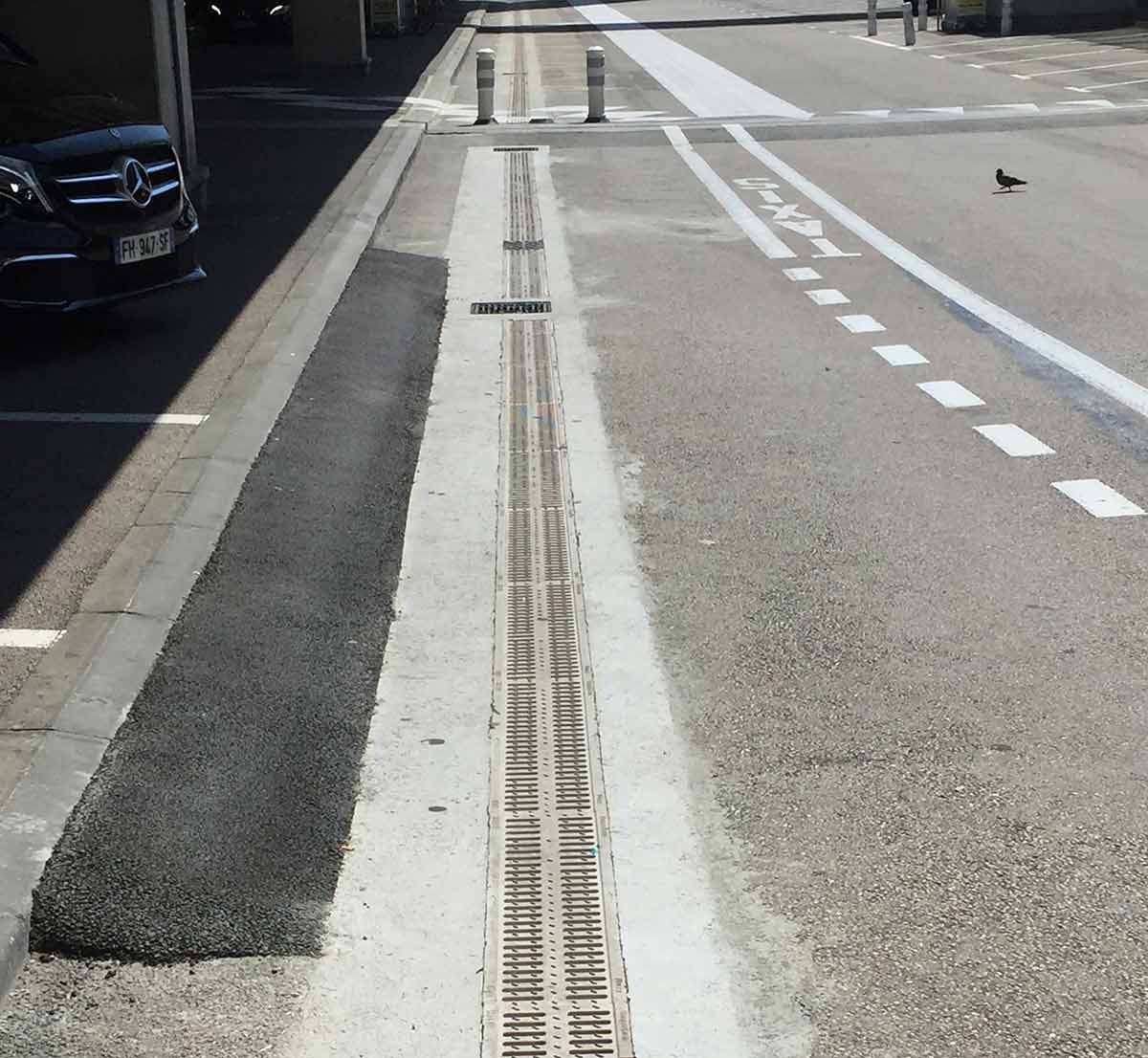 Foi no início de 2020 que o aeroporto notou que as grelhas dos canais instalados na estação de táxis do Terminal 2 se desprendiam do sistema de drenagem, e que a água infiltrava no estacionamento situado abaixo do terminal. Como o tráfego intenso de ônibus e táxis exigia uma calçada segura e bem equipada, o aeroporto procurou uma solução de drenagem nova que fosse eficaz, com durabilidade e adaptada às suas necessidades.