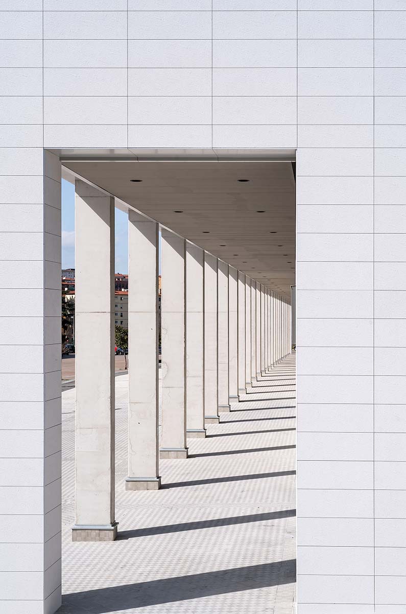 A utilização do branco na maior parte da superfície, junto com placas em tons verdes nos pátios internos, não é arbitrária, pois otimiza a reflexão da luz, contribuindo para a eficiência energética do edifício.